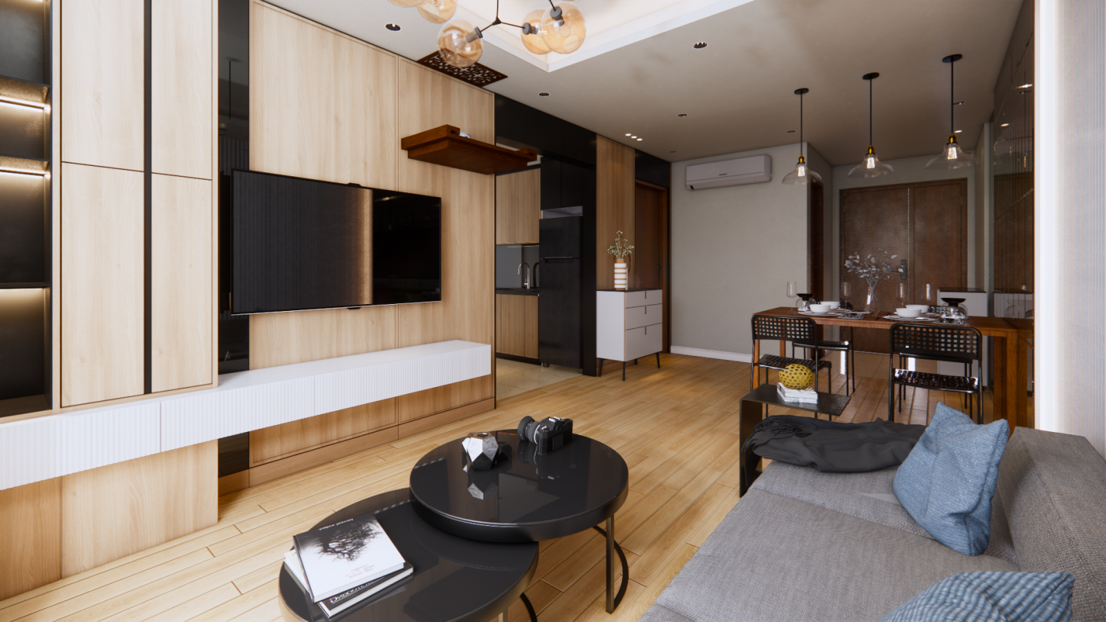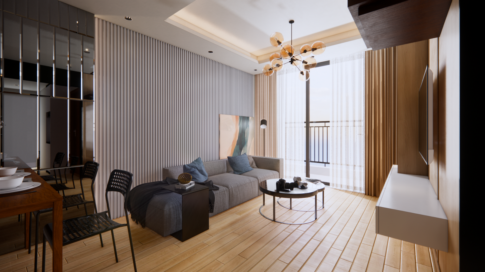 Sau khi khảo sát cũng như tiếp nhận đề bài của anh chị cho chúng tôi, chúng tôi đánh giá căn hộ ít khi có người ở vào các ngày trong tuần nên chúng tôi chọn tông chủ đạo một tông màu gỗ ánh hồng tạo cảm giác ấm áp cho căn hộ giảm không khí lạnh lẽo, kết hợp với những chi tiết màu đen để các chi tiết tinh tế hơn. Phòng khách chúng tôi chọn một chiếc sofa thật lớn, rộng rãi để có thể thoải mái thư giãn trên sofa mà không bị quá chật chội. Tại vị trí bàn ăn của căn hộ chung tôi sử dụng một mảng gương lớn để tạo cảm giác không gian căn hộ rộng hơn. Diện tích căn hộ không quá lớn nên chúng tôi không quá ưu tiên những diện tủ lớn tạo cảm giác ngột ngạt thừa thãi, các mảng vách lớn được ưu tiên hơn. Các tủ chúng tôi cố gắng tối ưu hóa công năng tủ để đảm bảo cho anh chị vẫn đủ diện tích để chứa đồ. Tuy nhà ít được sử dụng nhưng trong bếp chúng tôi vẫn thiết kế đảm bảo công năng sử dụng cho anh chị. Chúng tôi muốn có một căn bếp đầy đủ tiện nghi để anh chị có thể về nhà cuối tuần và sinh hoạt như một căn hộ bình thường. Phòng ngủ chính của anh chị chúng tôi chủ ý nhắc lại chi tiết ở phòng khách để tạo một sự thông suốt cho căn hộ từ phòng khách đến phòng ngủ. Chúng tôi không chủ ý đặt Tivi tại phòng ngủ mà tư vấn cho anh chị một chiếc Tivi lớn ở phòng khách vừa đề anh chị có không gian xem Tivi riêng ở phòng khách tránh ảnh hưởng đến giấc ngủ vừa là để khi con chị từ Hà Nội về có thể cùng bố mẹ ngồi xem Tivi ở phòng khách, gắn bó gia đình nhiều hơn.