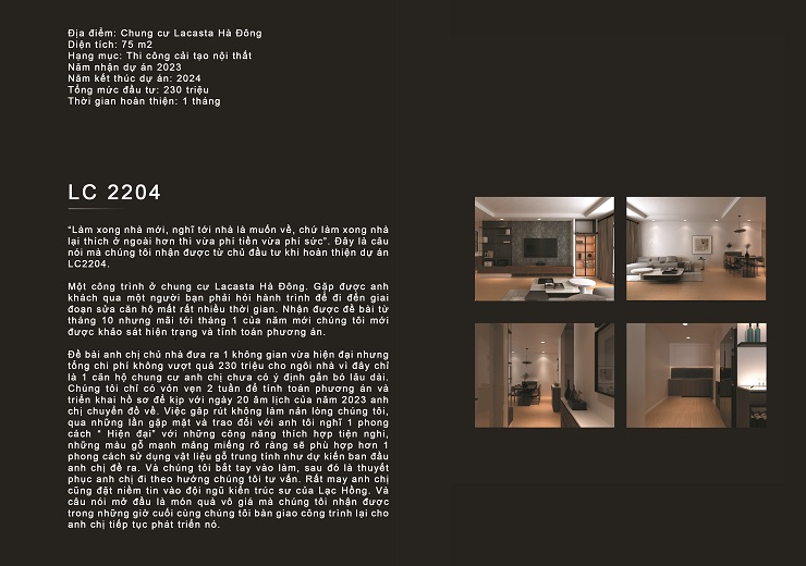 Đề bài anh chị chủ nhà đưa ra 1 không gian vừa hiện đại nhưng tổng chi phí không vượt quá 230 triệu cho ngôi nhà vi đây chỉ là 1 căn hộ chung cư anh chị chưa có ý định gắn bó lâu dài. Chúng tôi chỉ có vỏn vẹn 2 tuần để tính toán phương án và triển khai hồ sơ để kịp với ngày 20 âm lịch của năm 2023 anh chị chuyển đồ về. Việc gấp rút không làm nản lòng chúng tôi, qua những lần gặp mặt và trao đổi với anh tôi nghĩ 1 phong cách - Hiện đại" với những công năng thích hợp tiện nghi, những màu gỗ mạnh mảng miếng rõ ràng sẽ phù hợp hơn 1 phong cách sử dụng vật liệu gỗ trung tính như dự kiến ban đầu anh chị đề ra. Và chúng tôi bắt tay vào làm, sau đó là thuyết phục anh chị đi theo hướng chúng tôi tư vấn. Rất may anh chị cũng đặt niềm tin vào đội ngũ kiến trúc sư của Lạc Hồng. Và câu nói mở đầu là món quà vô giá mà chúng tôi nhận được trong những giờ cuối cùng chúng tôi bàn giao công trình lại cho anh chị tiếp tục phát triển nó.